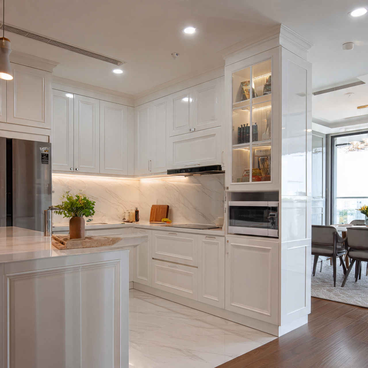 Hình 1: Không gian bếp sang trọng với tủ bếp nhựa chữ L hiện đại, màu trắng tinh tế.