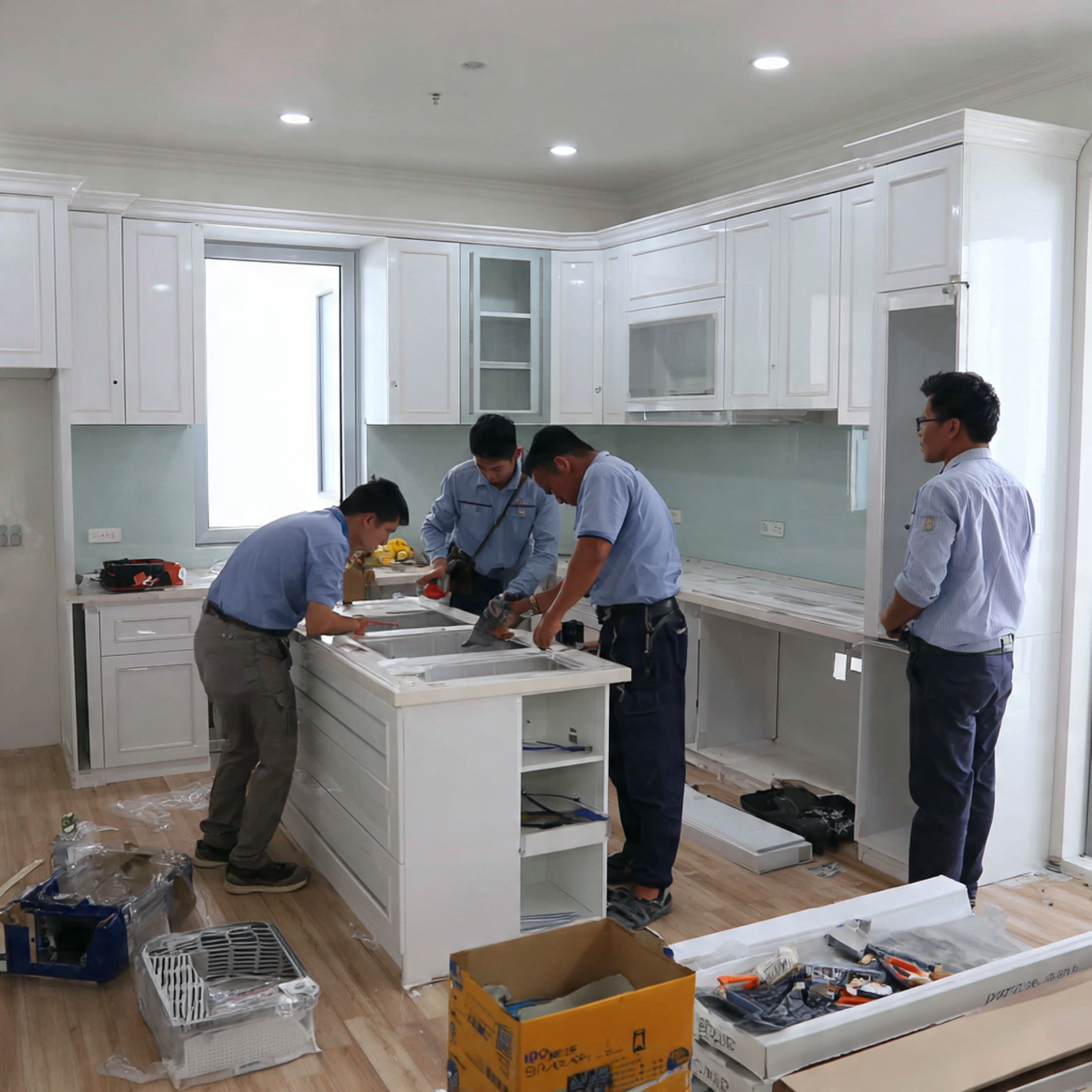 Hình 4: Đội ngũ kỹ thuật viên đang lắp đặt tủ bếp nhựa trọn gói cho khách hàng tại Quận 12.