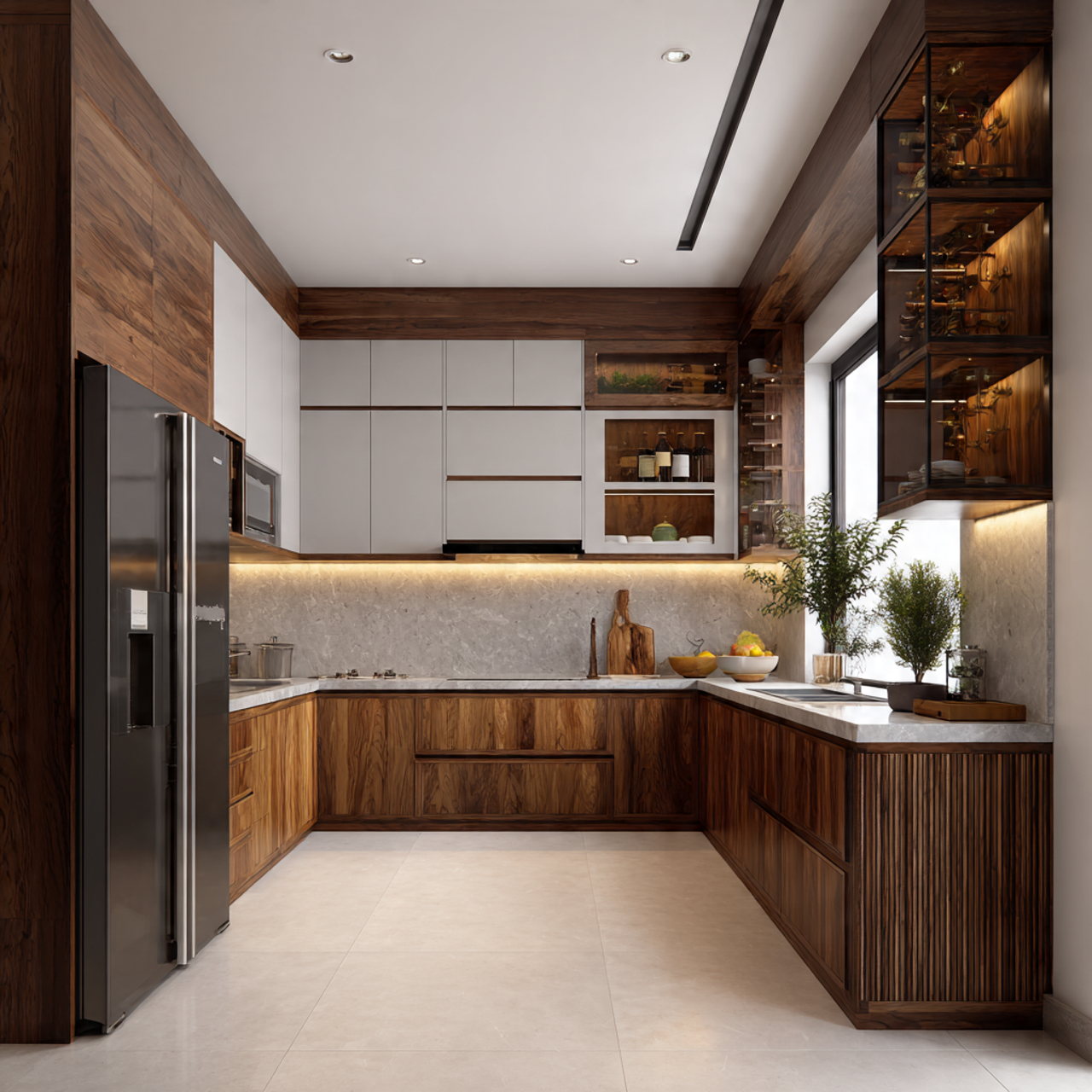 Hình 5: Mẫu tủ bếp nhựa chữ U vân gỗ cao cấp, phong cách hiện đại 2025.