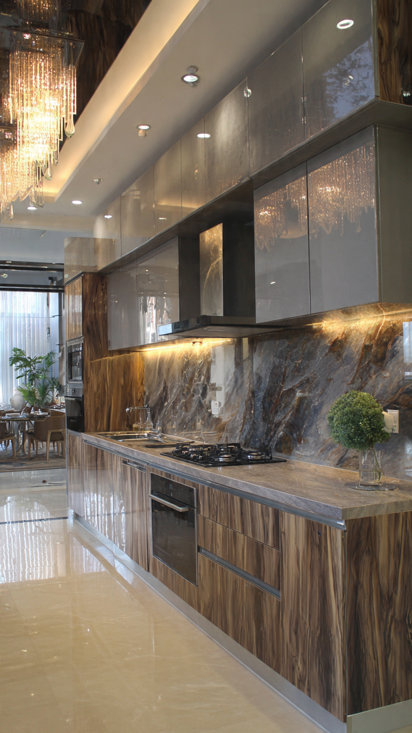 Hình 3: Mẫu tủ bếp Acrylic kết hợp vân gỗ sang trọng
