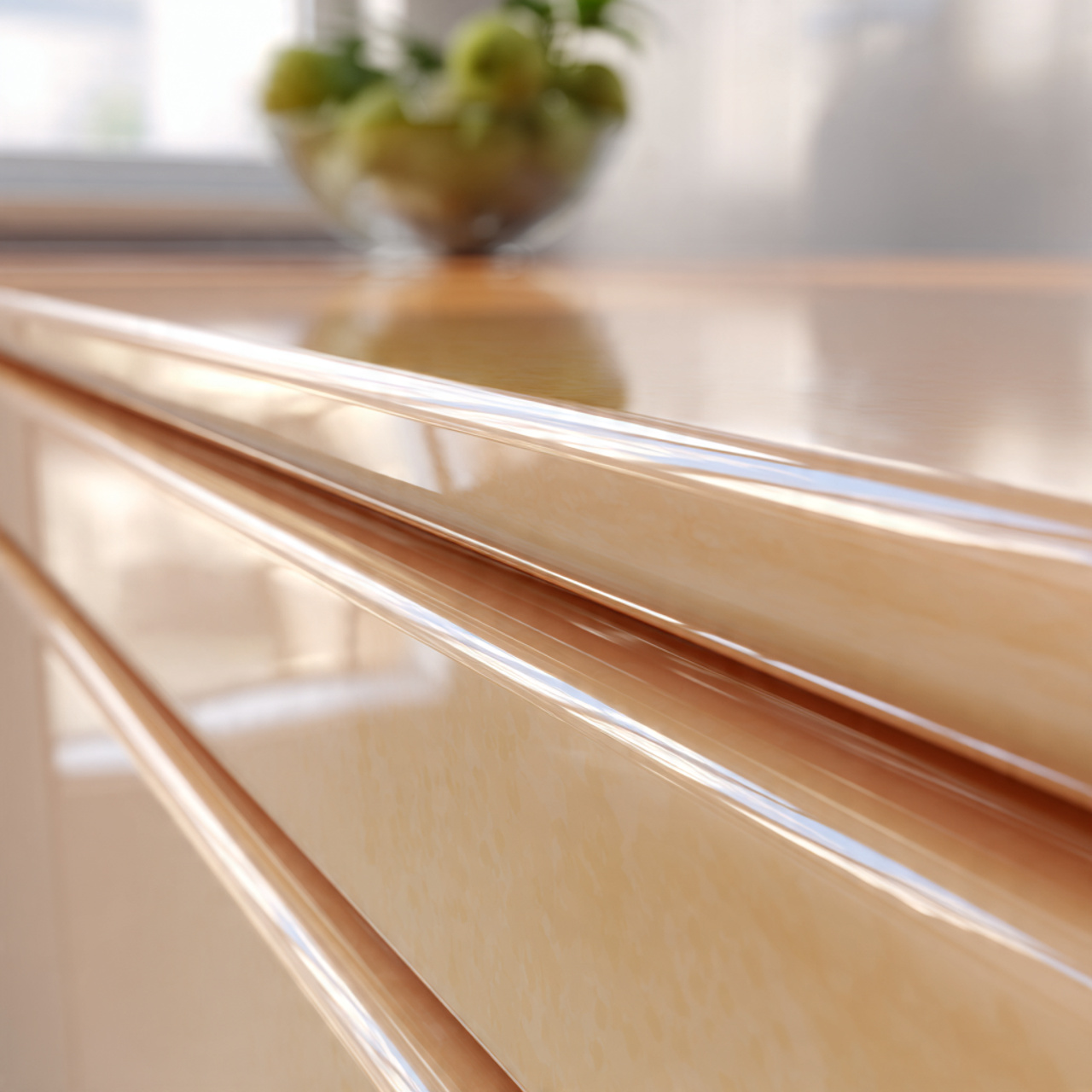 Hình 2: Cận cảnh bề mặt tủ bếp nhựa phủ Acrylic bóng gương sang trọng