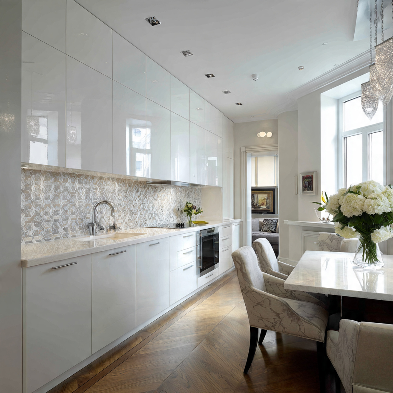 Hình 4: Tủ bếp nhựa Acrylic trắng bóng trong căn hộ cao cấp phong cách Bắc Âu