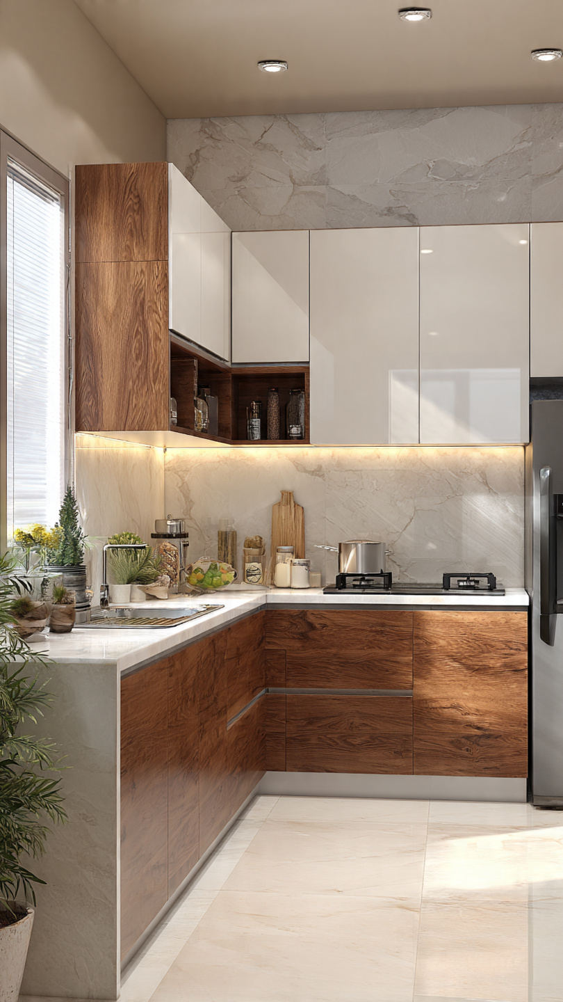 Sự kết hợp giữa màu vân gỗ ấm áp và cánh trắng sáng giúp bếp nhỏ không bị bí bách, vẫn giữ được nét ấm cúng.