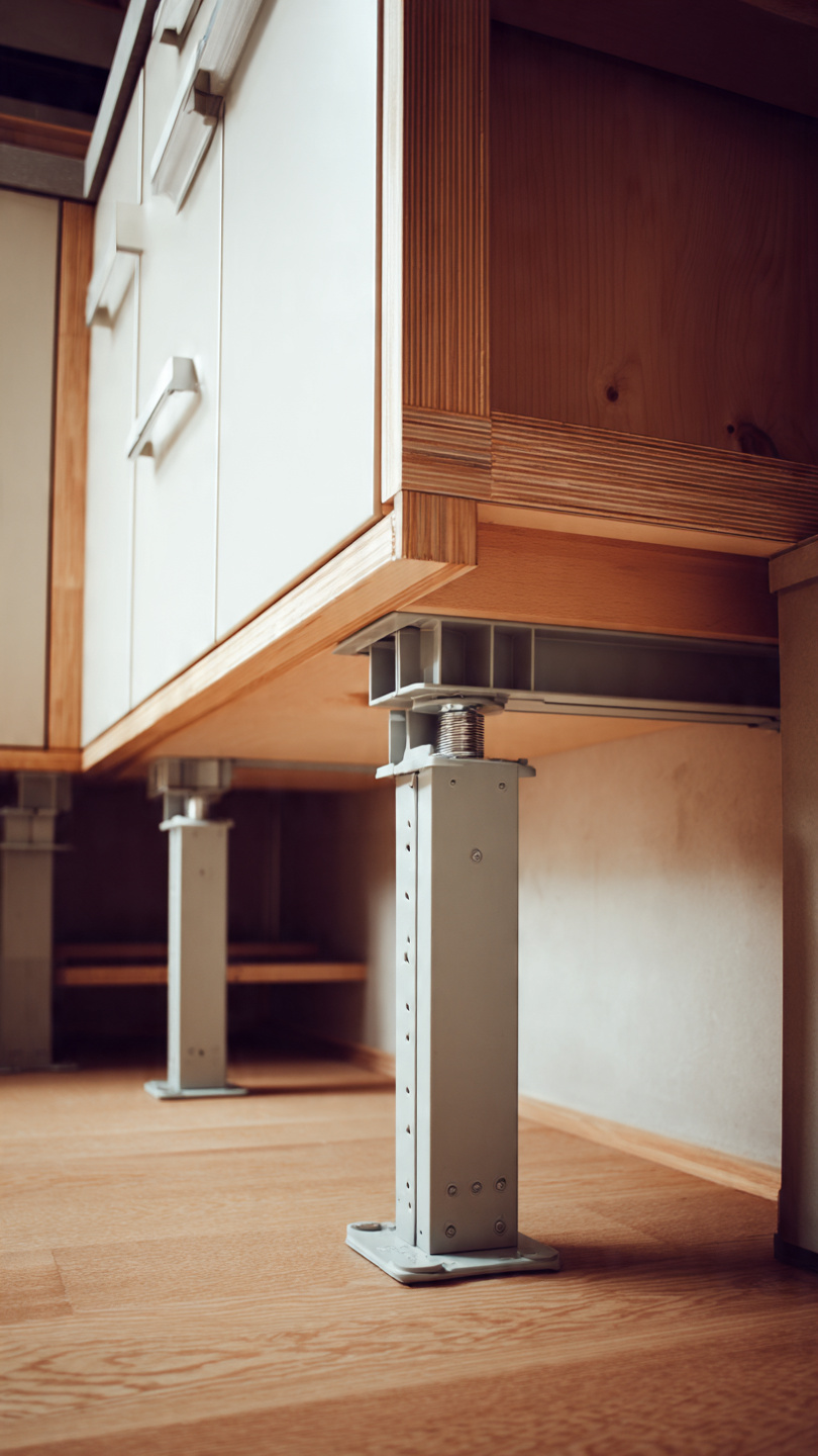 📸 Hình 3: Cấu tạo chân tăng chỉnh nhựa chịu lực dưới tủ giúp tủ bếp Picomat bền chắc, không ẩm mốc.