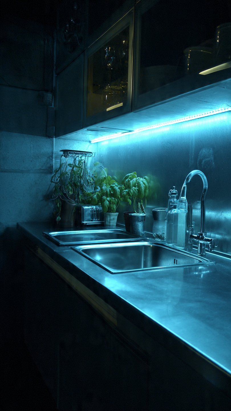 📸 Hình 4: Bố trí đèn led hắt sáng dưới tủ bếp nhựa giúp không gian bếp lung linh và tiện dụng.