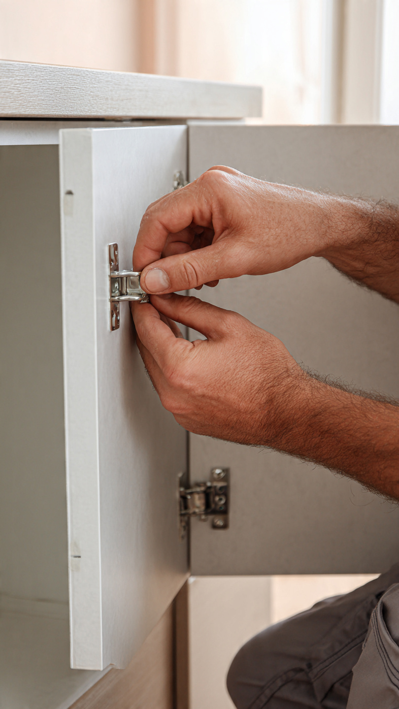 📸 Hình 5: Kỹ thuật viên Nội Thất Nhựa Công Truyền đang cân chỉnh lại bản lề giảm chấn cho cánh tủ bếp nhựa.