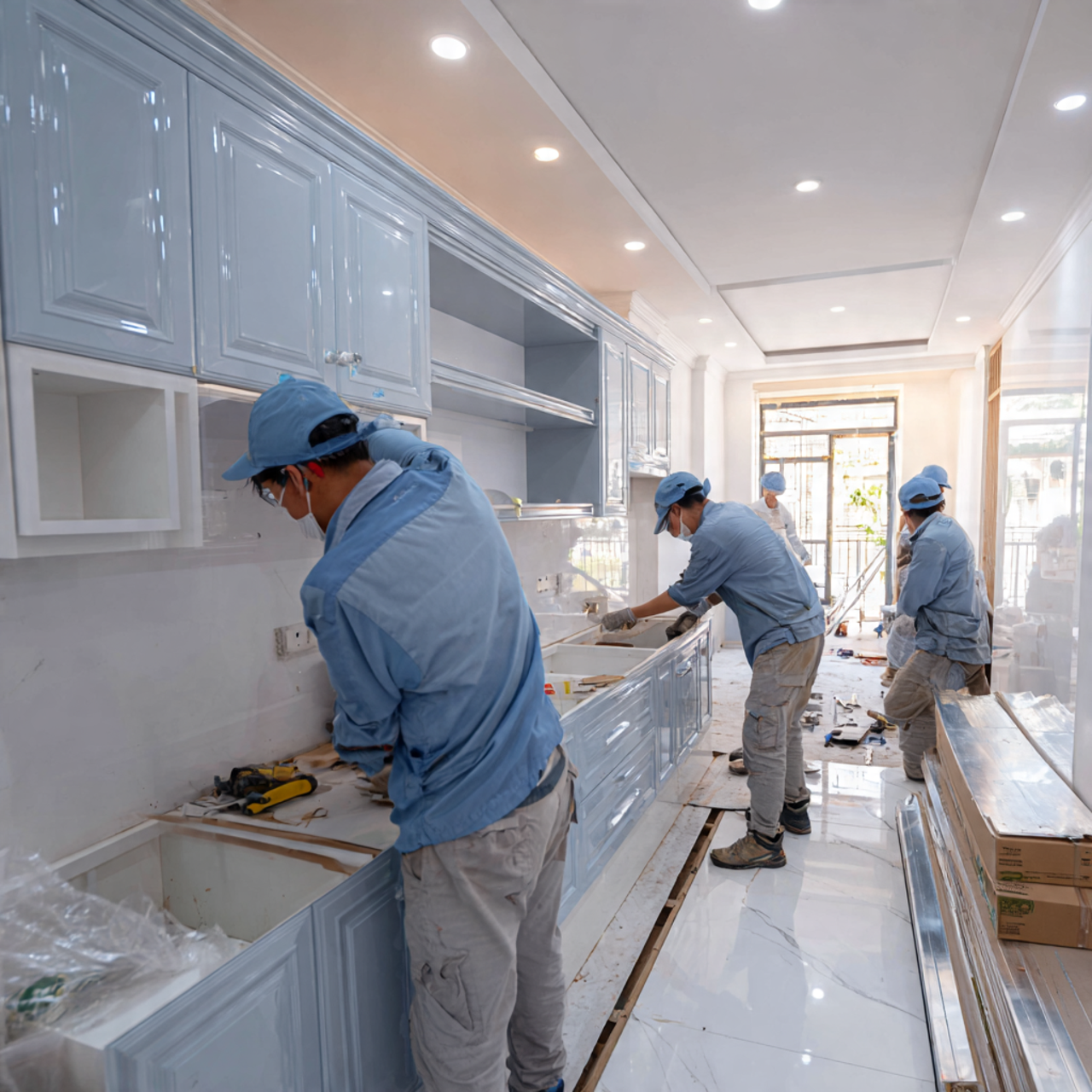 Hình 5: Nhân viên Nội Thất Nhựa Công Truyền đang lắp đặt tủ bếp nhựa tại nhà khách hàng.