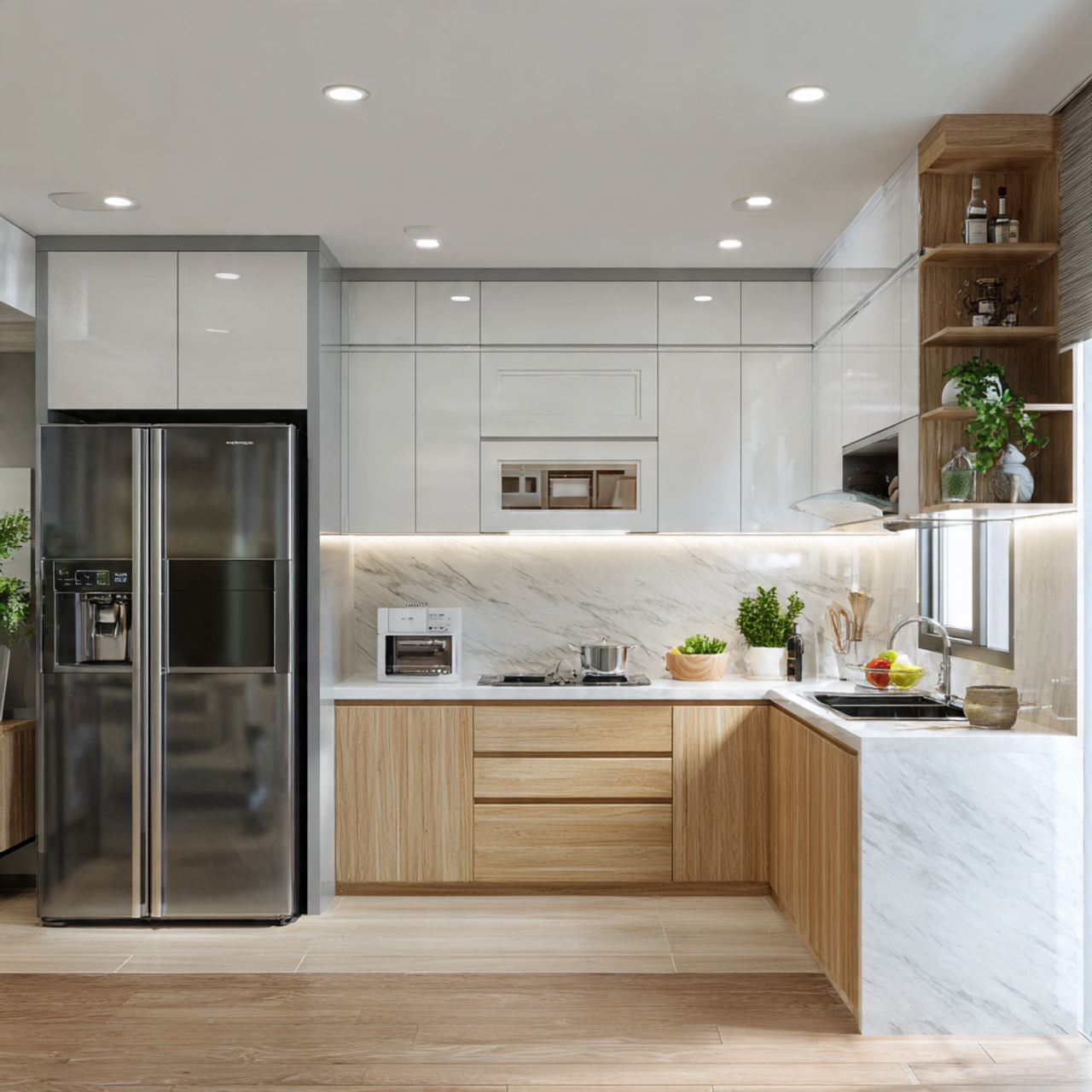 Phù hợp cho căn hộ nhỏ hoặc nhà phố, tủ bếp chữ L giúp tối ưu góc bếp, thuận tiện khi di chuyển.