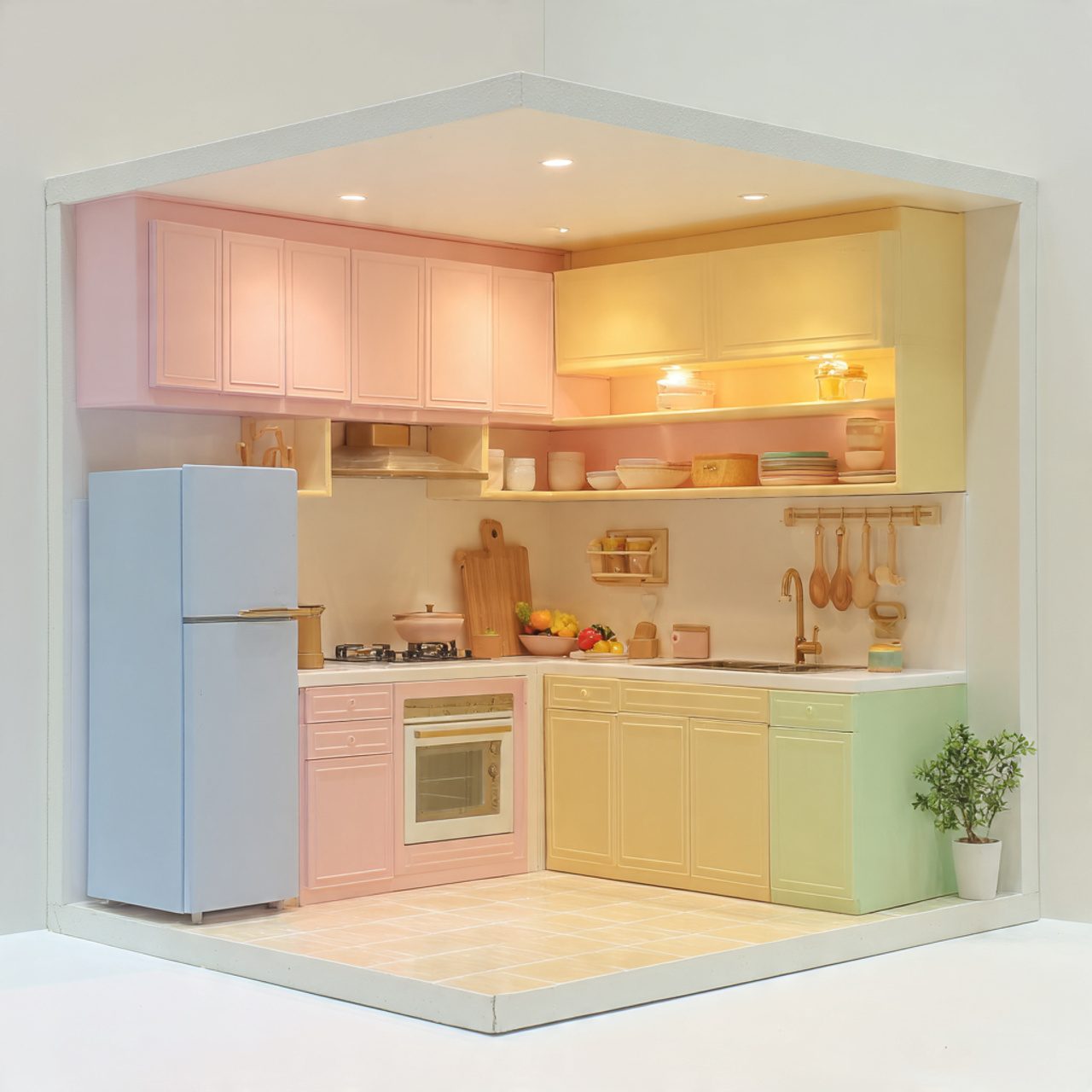 📷 Hình 4: Mẫu tủ bếp nhựa chữ L màu pastel trẻ trung, thiết kế bởi Nội Thất Nhựa Công Truyền.
