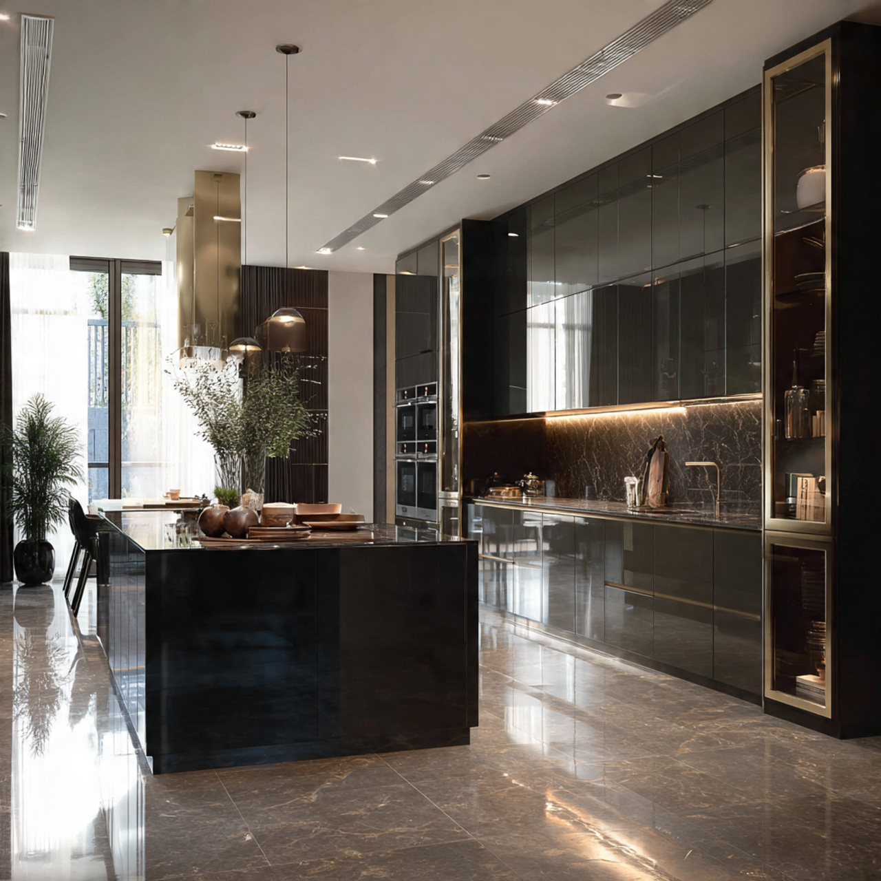 📷 Hình 5: Mẫu tủ bếp nhựa Acrylic đen bóng phong cách Luxury tại dự án Celadon City.