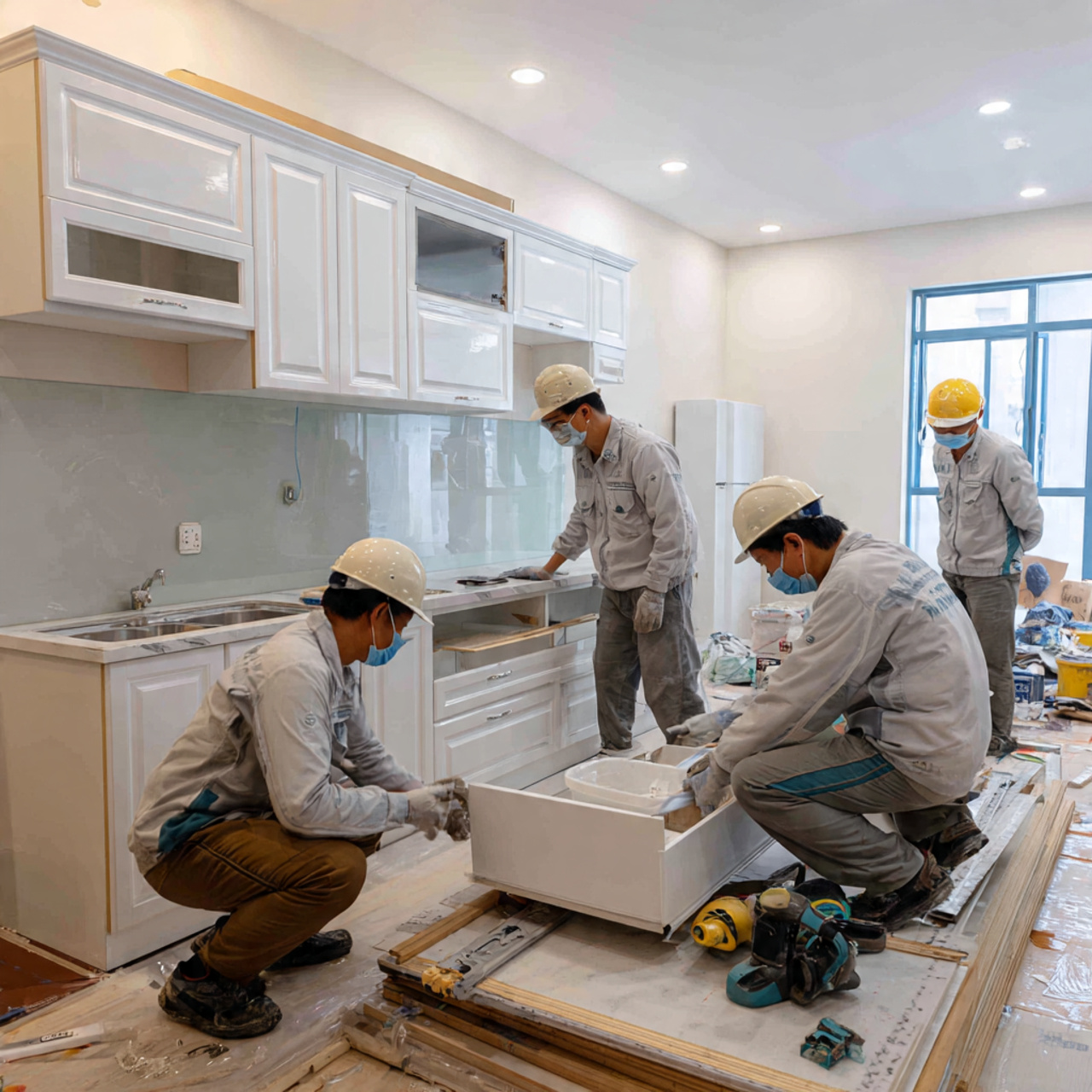 Đội ngũ thi công đến tận nơi lắp đặt tủ bếp gọn gàng, an toàn, đúng bản vẽ.