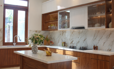 - Biệt thự Long Thành: tủ bếp nhựa Đài Loan kết hợp mặt đá nhân tạo.