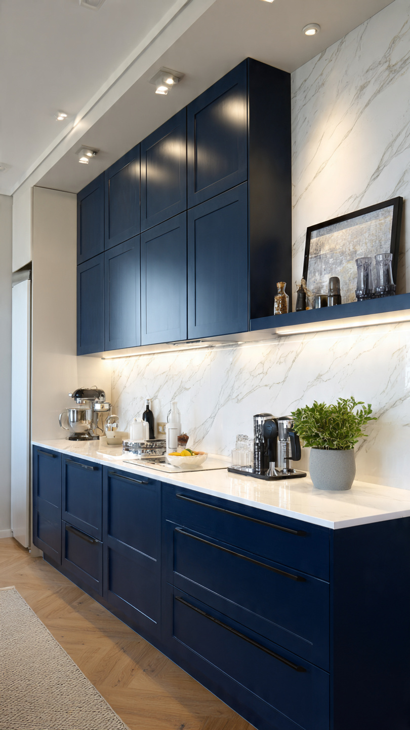 📸 Hình 3: Tủ bếp nhựa Picomat xanh navy kết hợp mặt đá trắng vân mây