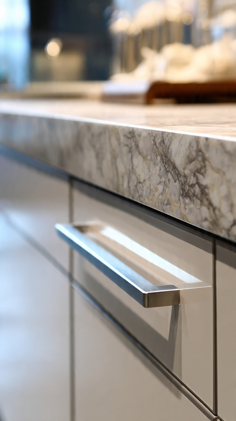 Một trong những yếu tố quan trọng tạo nên vẻ thanh lịch của tủ bếp acrylic chính là thiết kế phẳng, liền mạch, hạn chế tối đa các chi tiết rườm rà. Các cánh tủ thường được thiết kế không tay nắm hoặc tay nắm âm, tạo cảm giác tinh gọn, hiện đại và rất sang trọng.