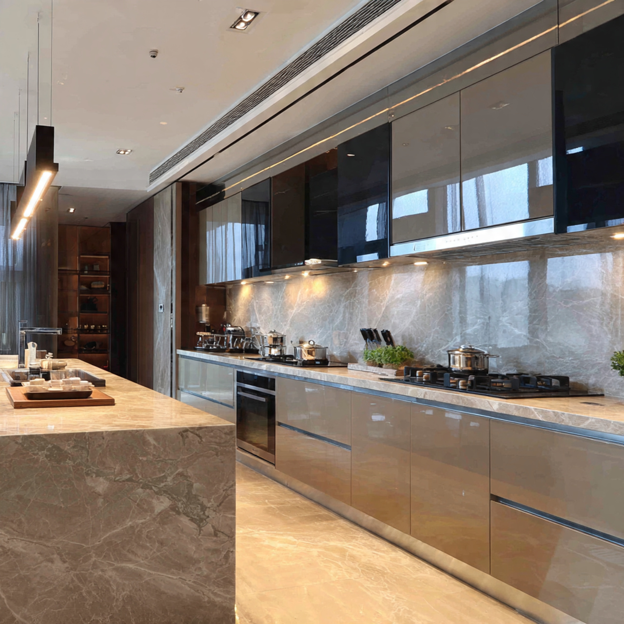🖼️ Hình 5: Ứng dụng tủ bếp nhựa Acrylic bóng gương trong không gian căn hộ cao cấp.