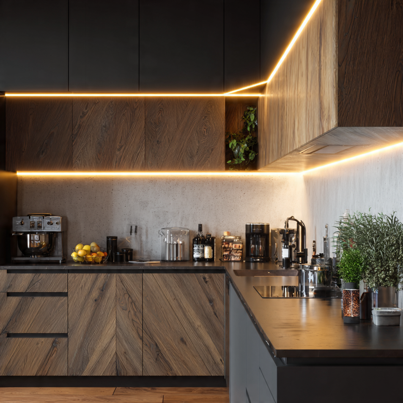 Lắp đặt ở đáy tủ trên, chiếu sáng khu vực bàn bếp – vừa tiện dụng, vừa tạo hiệu ứng ánh sáng sang trọng.