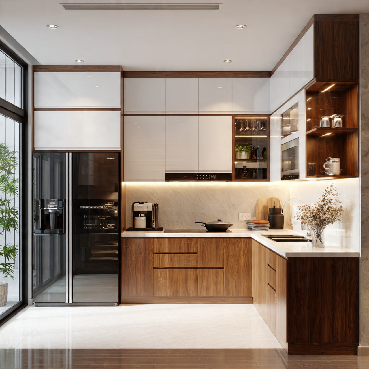 - Tủ bếp nhựa chữ L phối màu trắng – vân gỗ
