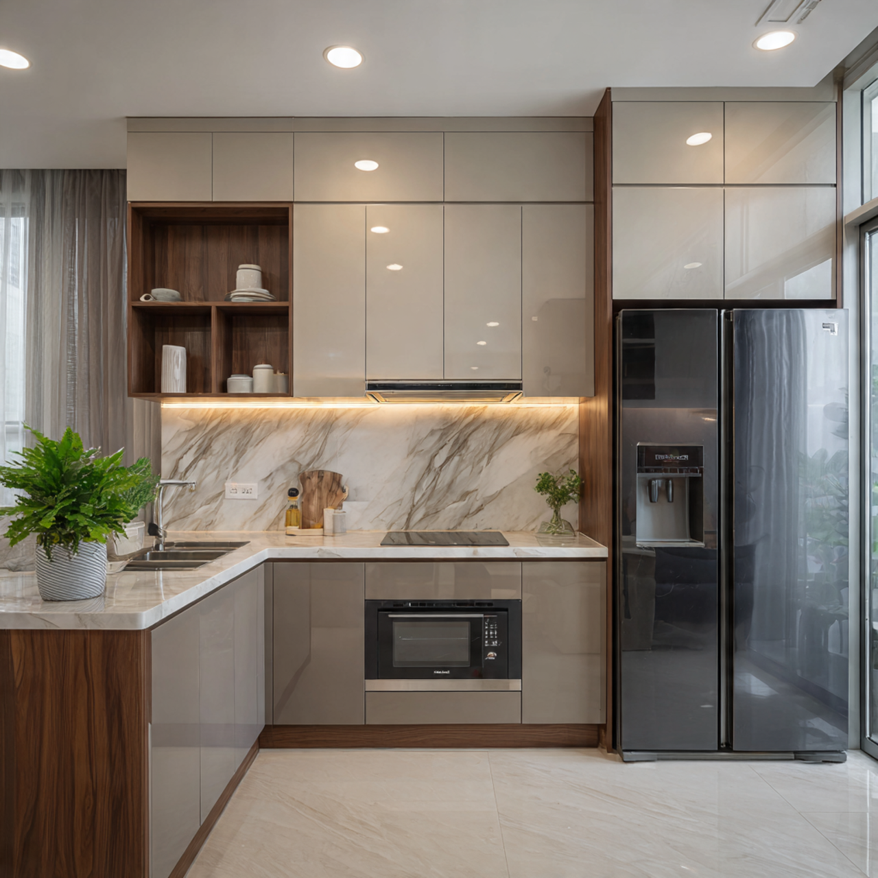 - Tủ bếp nhựa Acrylic bóng gương hiện đại