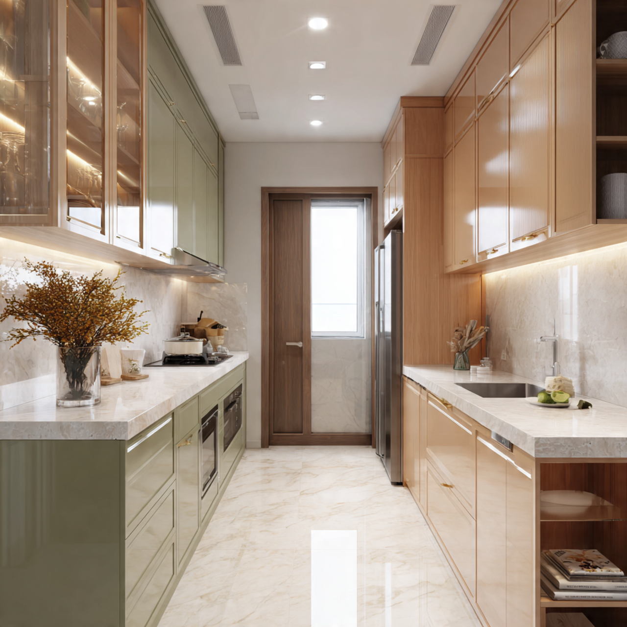 - Phụ kiện: Bản lề inox, ray trượt giảm chấn, tay nắm âm – đảm bảo vận hành êm ái.