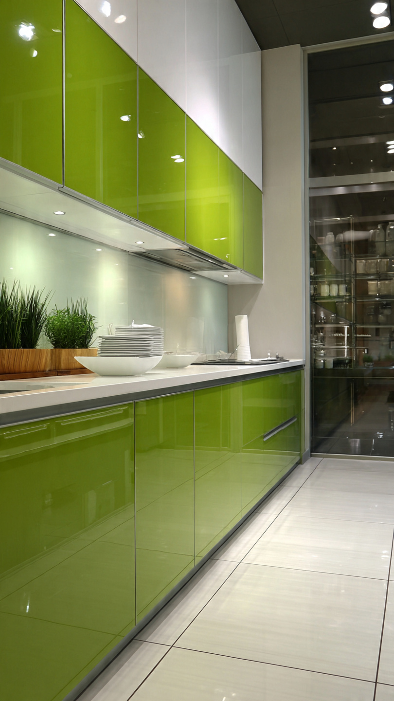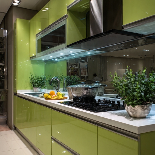 Hình 5: Tủ bếp Picomat kết hợp kính cường lực màu xanh lá siêu sạch