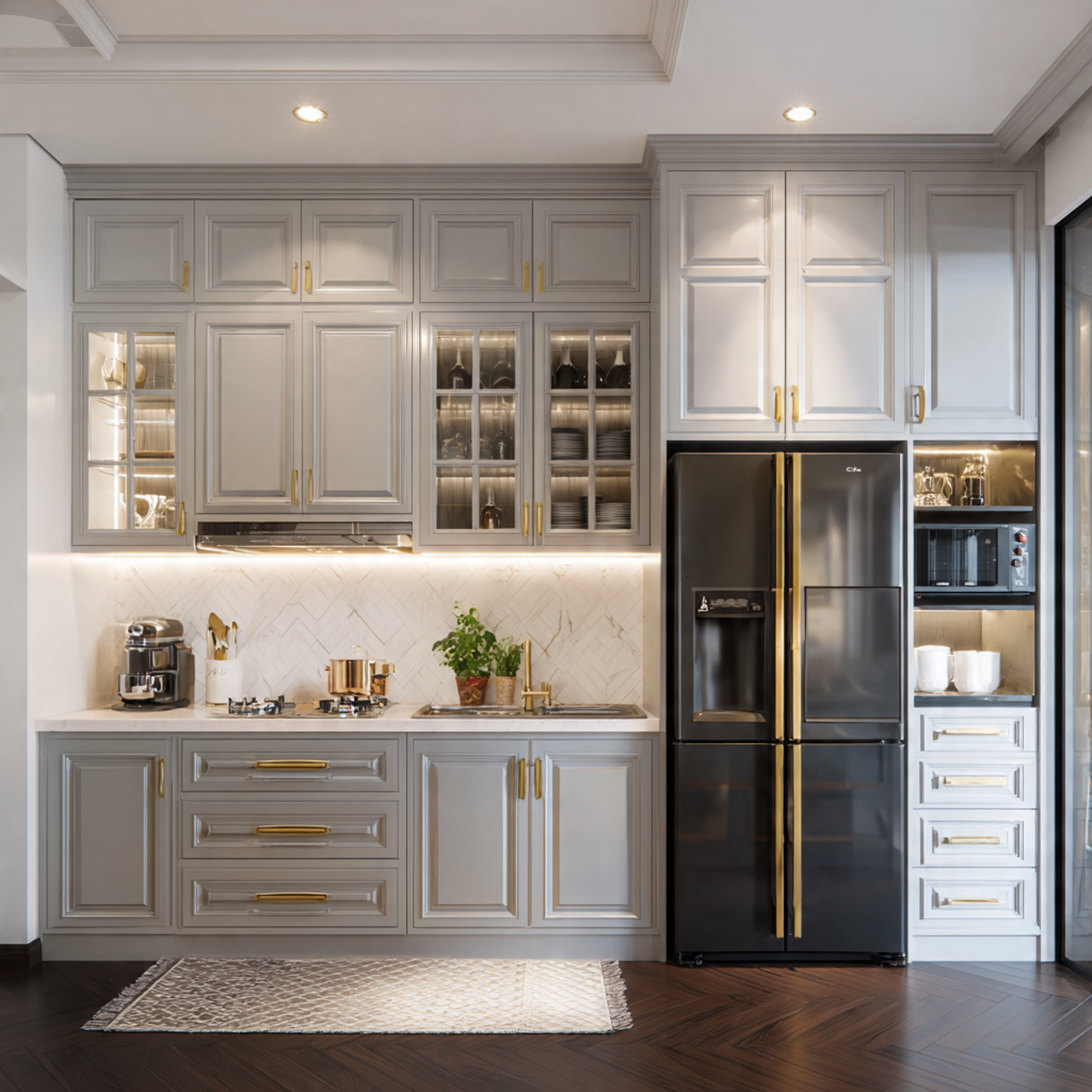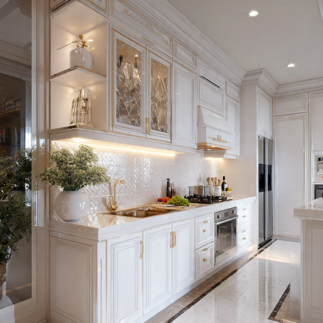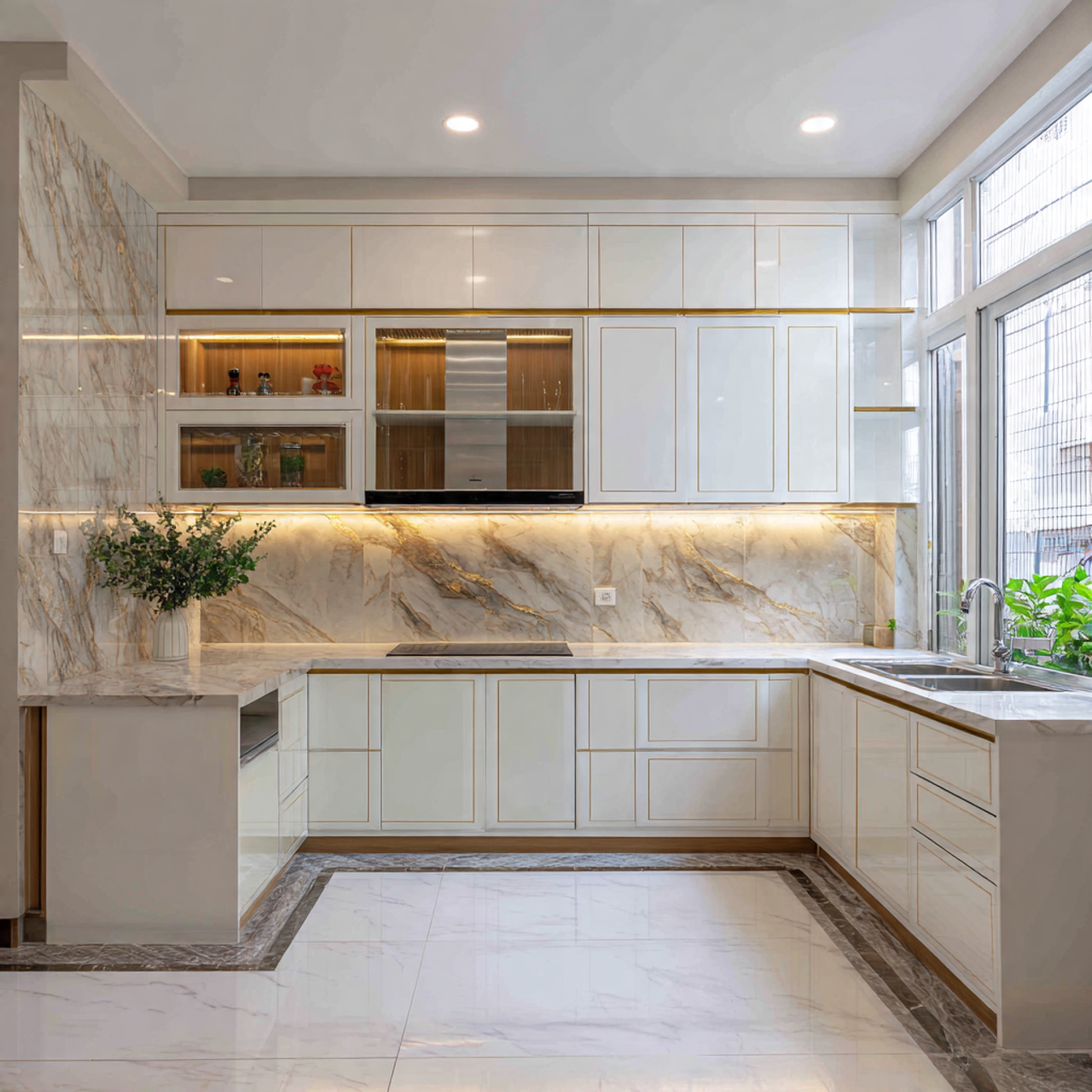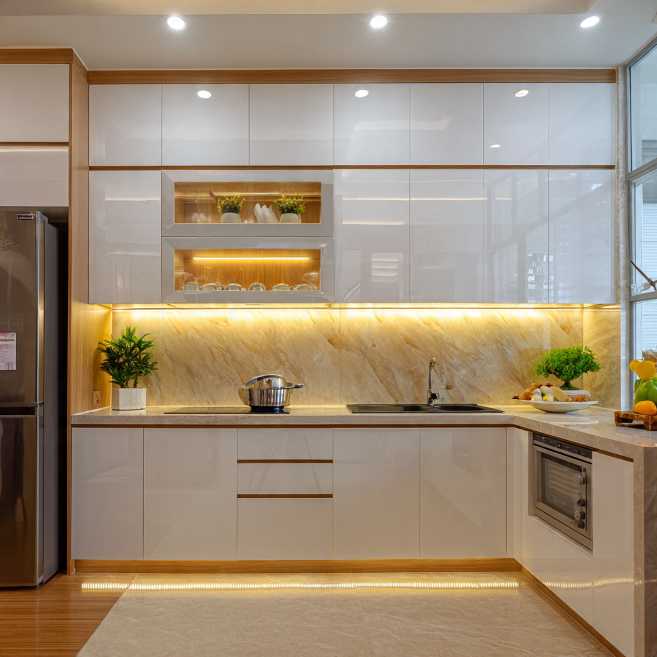 🖼️ Hình 3: Hệ thống đèn LED âm tủ mang lại ánh sáng tinh tế cho không gian bếp hiện đại