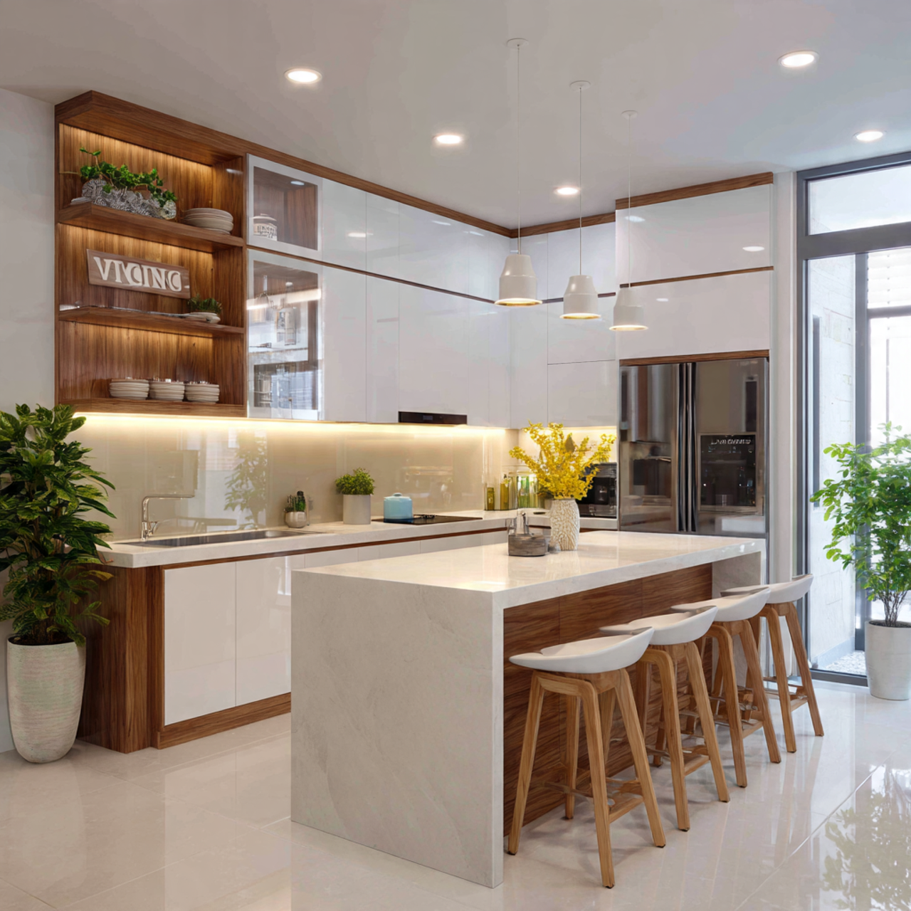 - Không gian rộng, kết hợp đảo bếp trung tâm và đèn LED âm trần.