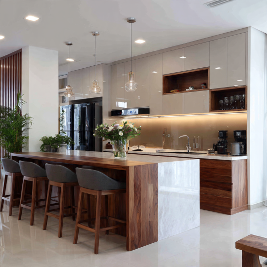 Kết hợp giữa bếp nấu và bàn ăn, tạo không gian sinh hoạt hiện đại, ấm cúng.