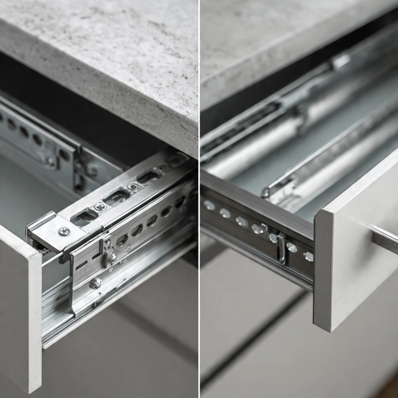 🖼️ Hình 2: Cận cảnh phụ kiện tủ bếp cao cấp – ray trượt, bản lề giảm chấn và tay nắm inox sáng bóng.