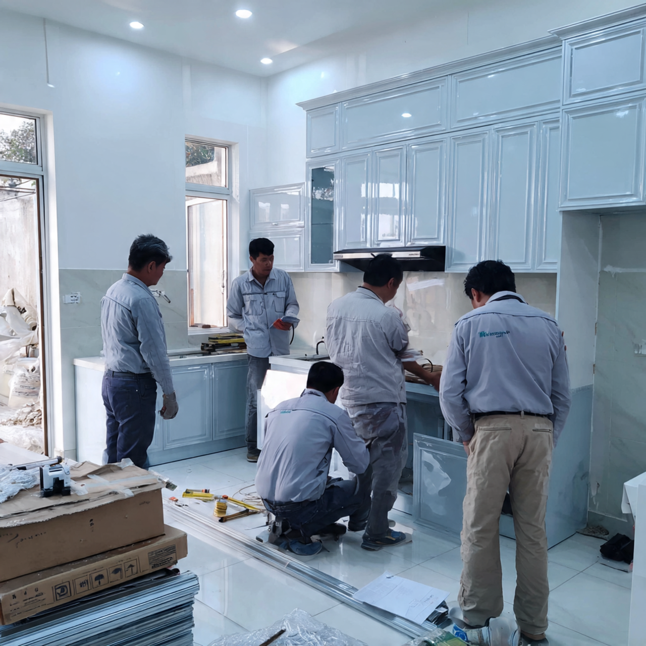🖼️ Hình 5: Đội ngũ thiết kế & kỹ thuật Nội Thất Nhựa Công Truyền trong quá trình hoàn thiện công trình thực tế cho khách hàng.