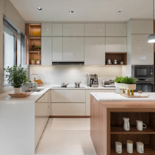 - Phòng bếp: Tủ bếp, kệ để đồ.